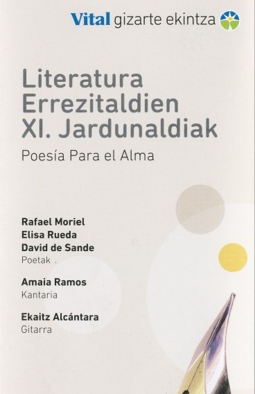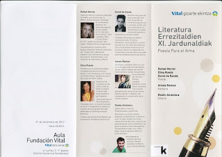 El día 21-12-2012 a las 20:00h en el «Aula Fundación Caja Vital» (centro comercial Dendaraba de Vitoria-Gasteiz), tendrá lugar un recital poético en el que los autores Rafael Moriel (poesía + guitarra), Elisa Rueda (poesía), David de Sande (poesía + guitarra), Amaia Ramos (cantante) y Ekaitz Alcántara (guitarra), recitarán sus poemas e interpretarán diversos temas musicales.