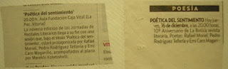 «Con el recuerdo del recientemente fallecido Mariano Iñigo y de su poesía, hoy tendrá lugar la décimo primera edición de los Recitales Literarios de la Obra Social de Caja Vital, una cita que se desarrollará bajo el título "Poesía para el Alma". El encuentro estará protagonizado por Rafael Moriel, Elisa Rueda y David de Sande, que recitarán diversas creaciones propias. Subirán al escenario acompañados de Amaia Ramos (cantante) y Ekaitz Alcántara (guitarra), quienes pondrán el contrapunto musical a una velada que arrancará a las 20.00 horas en el Aula Fundación».