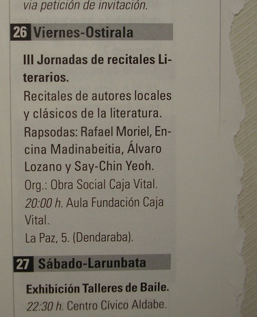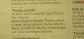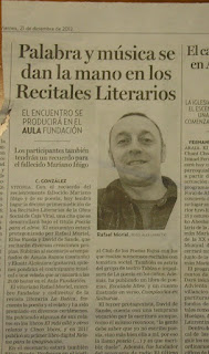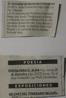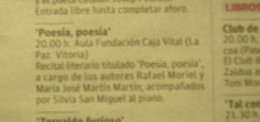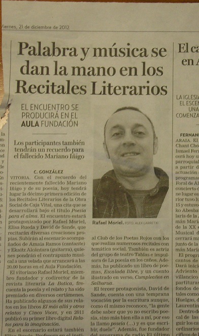 «Con el recuerdo del recientemente fallecido Mariano Iñigo y de su poesía, hoy tendrá lugar la décimo primera edición de los Recitales Literarios de la Obra Social de Caja Vital, una cita que se desarrollará bajo el título "Poesía para el Alma". El encuentro estará protagonizado por Rafael Moriel, Elisa Rueda y David de Sande, que recitarán diversas creaciones propias. Subirán al escenario acompañados de Amaia Ramos (cantante) y Ekaitz Alcántara (guitarra), quienes pondrán el contrapunto musical a una velada que arrancará a las 20.00 horas en el Aula Fundación».