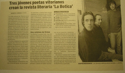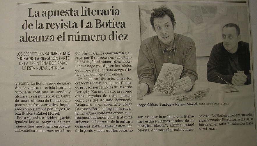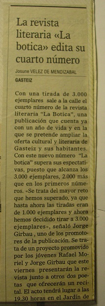 | «La Botica, revista literaria» 3500 ejemplares distribuidos en más de 100 locales y librerías Diario de Noticias de Álava (25-2-2007) |