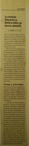 | Presentación del nº 3 «La Botica, revista literaria» Diario El Correo (26-9-2001) |