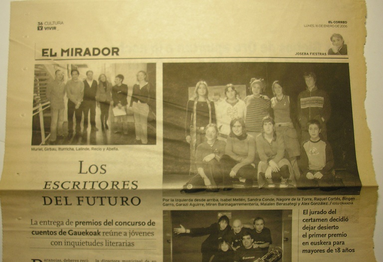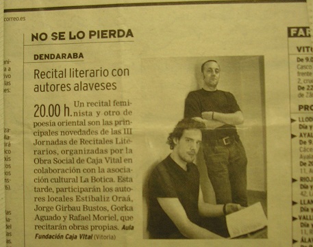 «La activa asociación La Botica da un paso más en su apuesta por la narrativa local al editar una recopilación de relatos y poesía, coordinada por Rafael Moriel, con el objeto de dar voz a jóvenes gasteiztarras que encontrarán dificultades para hacerse oír en la burocracia de las editoriales convencionales».