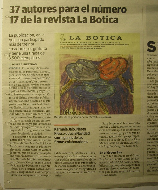 | «La Botica, revista literaria» 37 creadores entre sus páginas. Diario El Correo (2-12-2011) |
