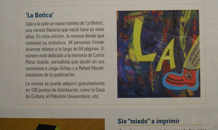 | «La Botica, revista literaria» 30 firmas artísticas en 64 páginas (septiembre de 2007) |