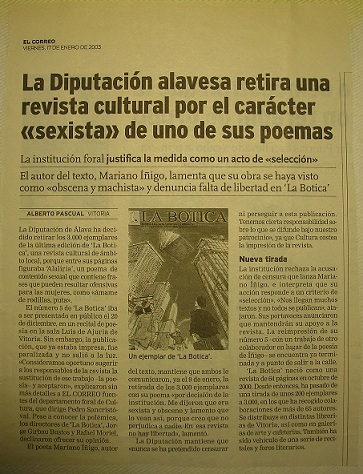 | Regreso de «La Botica, revista literaria» tras la censura que destruyó una tirada completa de 3000 ejemplares Diario de Noticias de Álava (24-5-2006) |